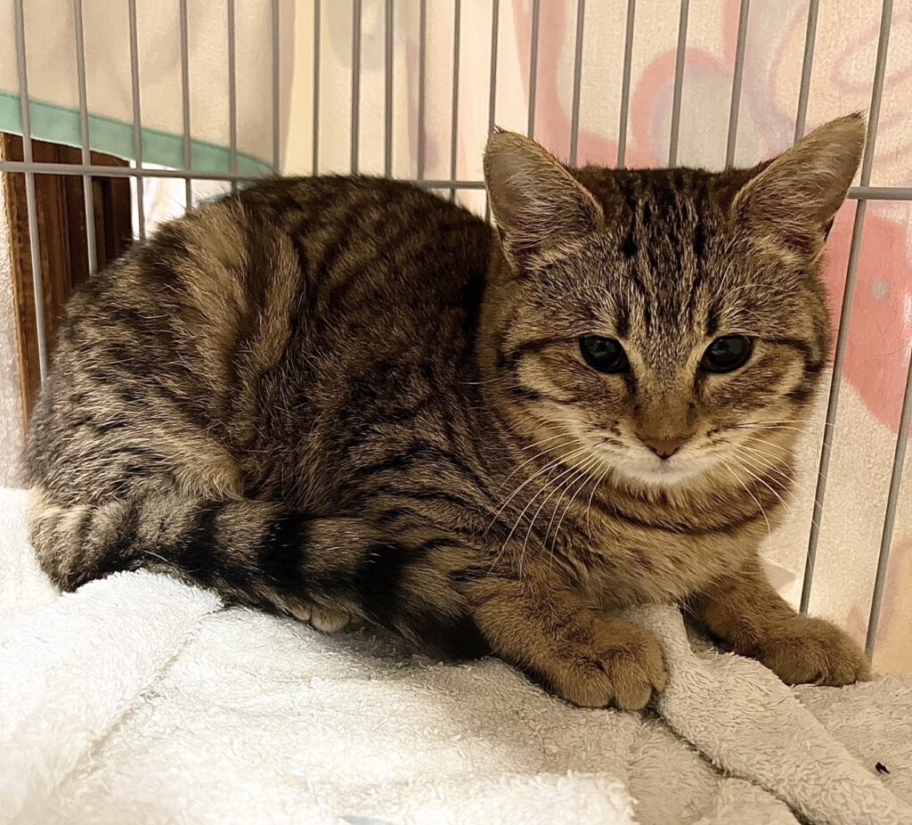 【特徴】1歳なのに2キロと小柄な小虎ちゃん。多頭飼育の状態で食い負けていて、小さいみたい。健康状態は問題なし。